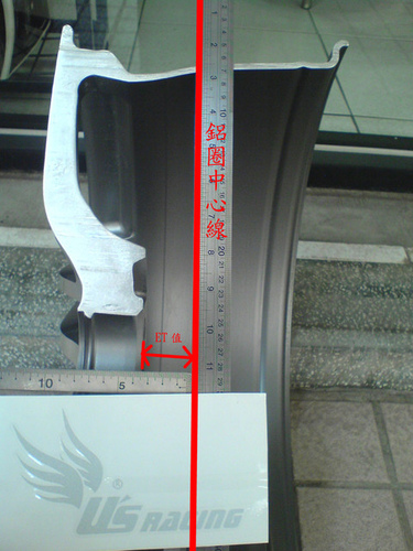 今天的重頭戲,也是大家很常用到的規格,文字的解釋是「鋁圈中心線到安裝面的距離」, 每次有車友問我都這樣回答,但是我想應該有一半以上的車友聽不懂吧, 這次我想從左圖應該就可以看的非常清楚了吧,中心線往左量為+(正),往右量為-(負), 例如下面這顆鋁圈就是+35mm,也就是ET35,ET值愈小輪子愈往外凸,為什麼呢?
