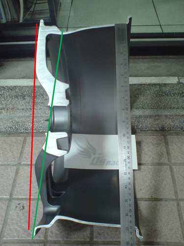 我解釋一下註一的功用,我們參考這一張圖,輪胎的大小為紅線的部份,要將輪胎裝入很明顯的是會受到圈耳造型阻擋而無法順利安裝,而綠線表示的也是輪胎的大小,它利用了上圖註一的位置而閃過了一邊的圈耳,如此才能順利的裝入輪胎...